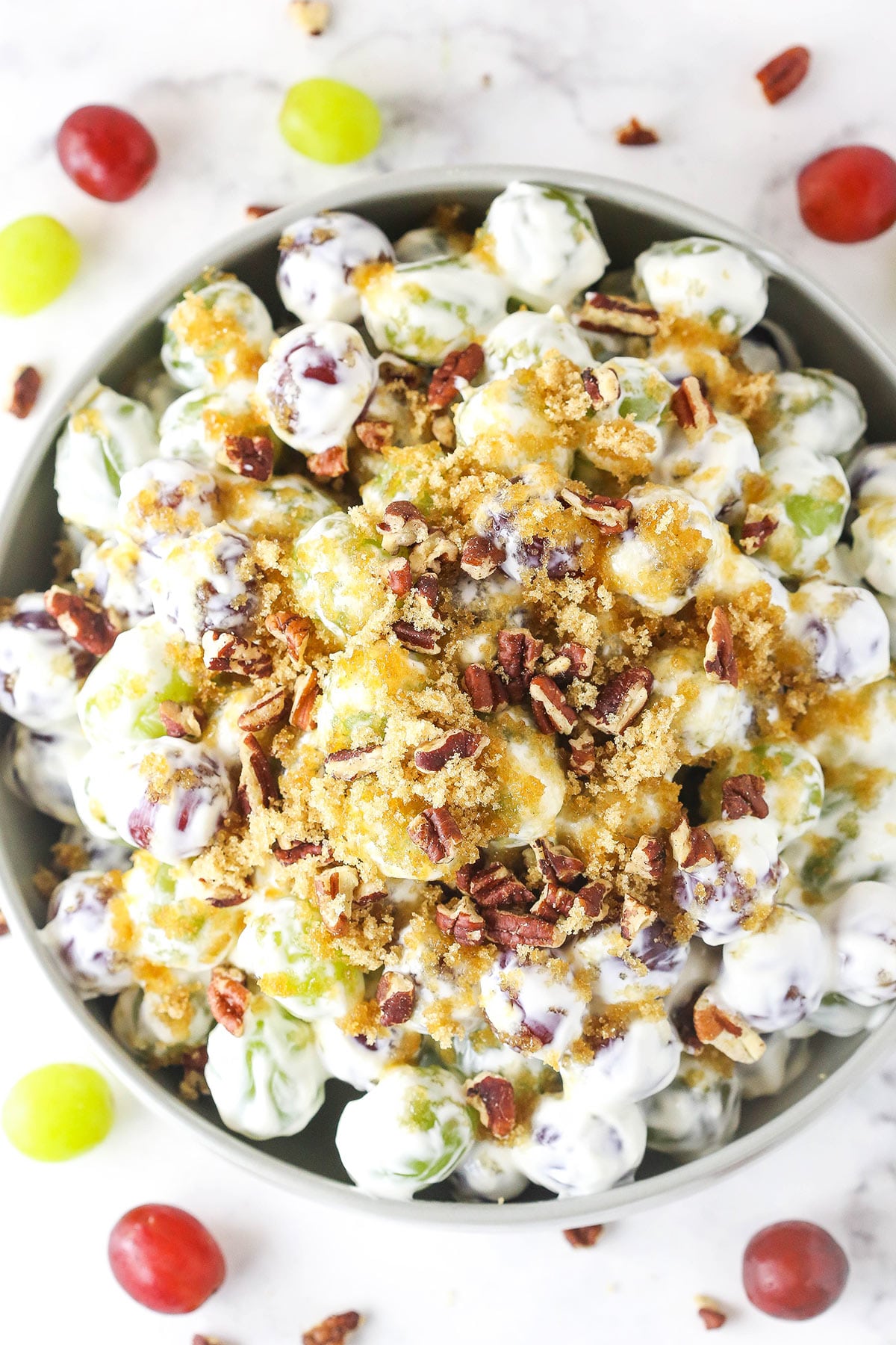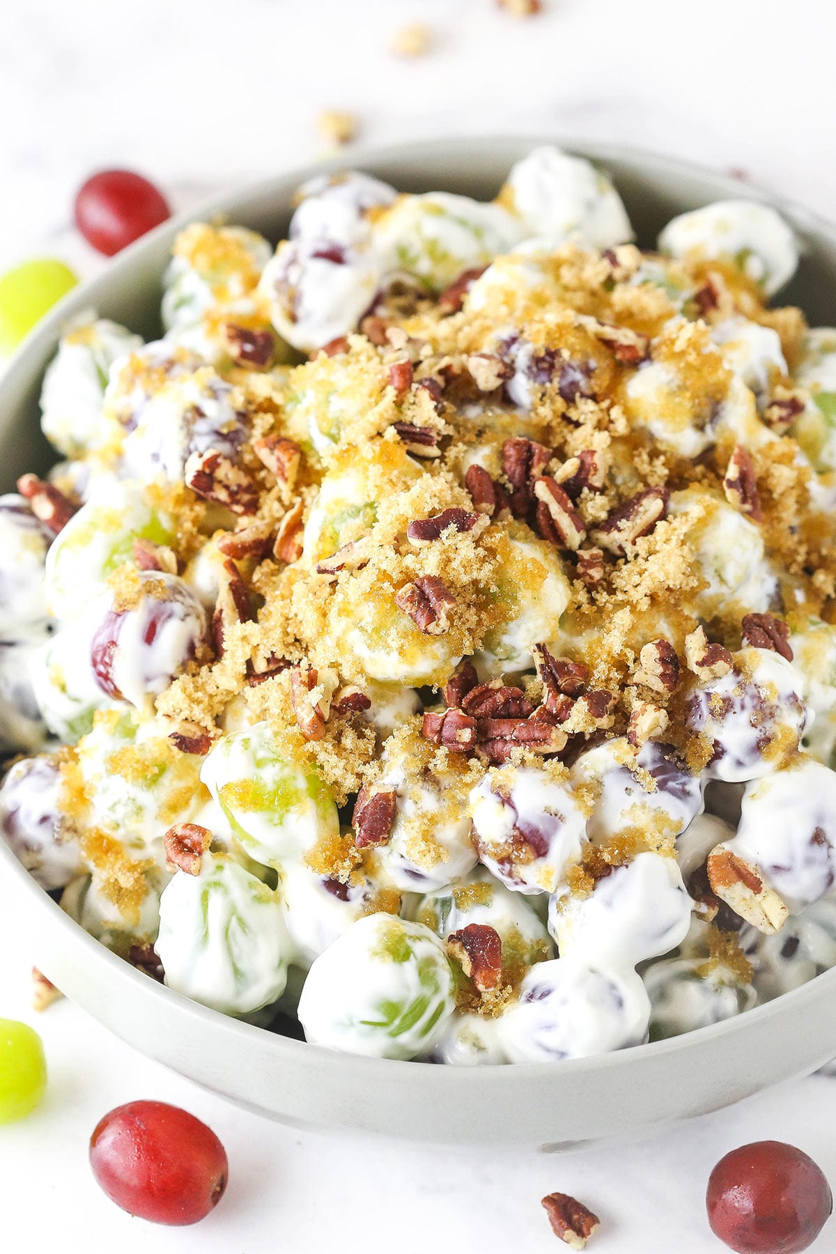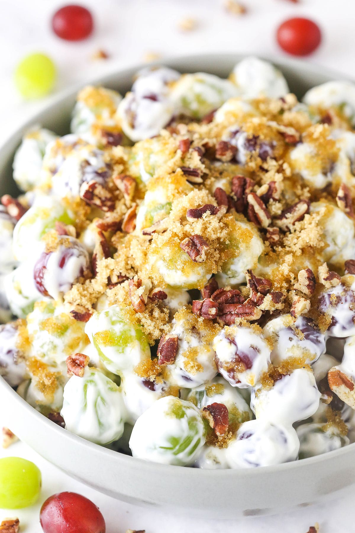 This grape salad recipe is totally irresistible, made with grapes, pecans, creamy dressing, and crumbly brown sugar. It’s easy to make and perfect for potlucks, holiday parties, and brunches. If you’ve never tried it before, you have to give this refreshing dessert salad a try!