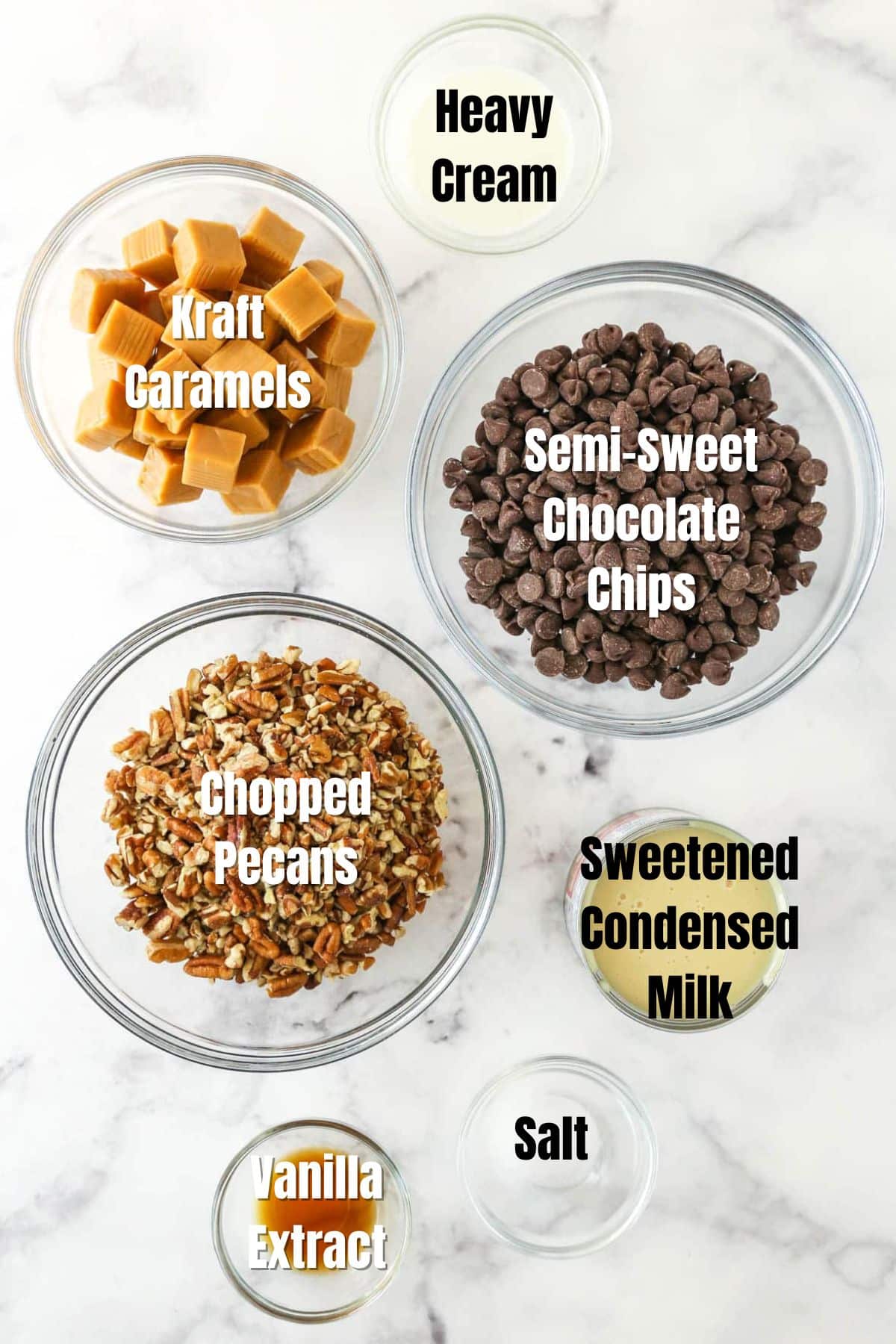 - Kraft Caramels โ These are what I use, and I’ll be the first to say that I havenโt tried other brands because they’re so perfect. Other brands may be more or less firm and therefore change the texture of the caramel layer.