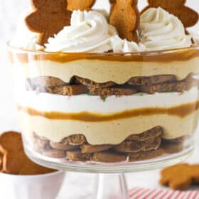 This Gingerbread Cheesecake Trifle is an easy no-bake holiday dessert! It has layers of thick gingerbread cookies, no-bake gingerbread cheesecake, caramel and whipped cream. It’s perfect for holiday parties!