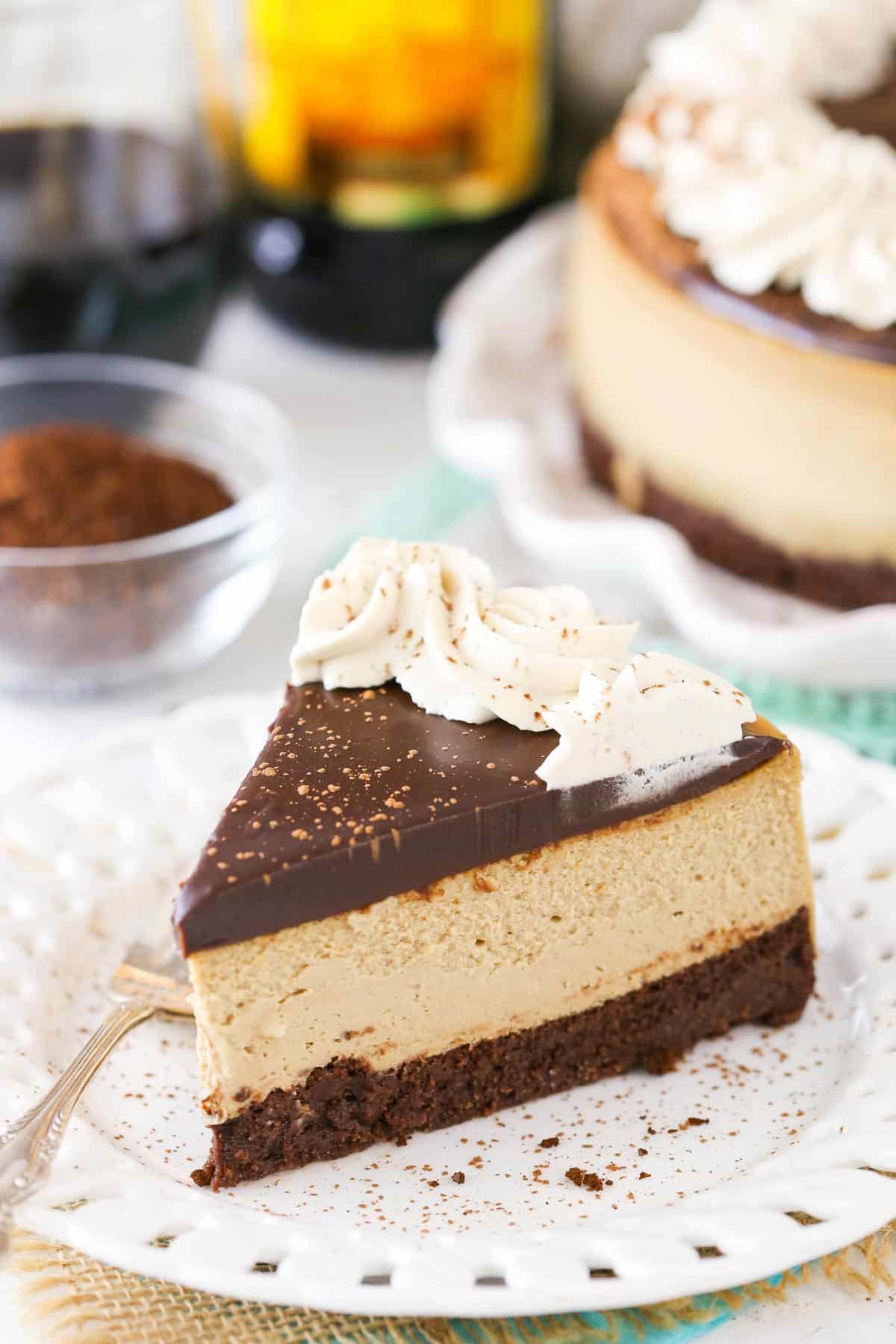 This Kahlua Coffee Brownie Cheesecakeย is made with a dense brownie on the bottom, kahlua and coffee cheesecake in the middle, and a layer of homemade chocolate ganache and kahlua whipped cream on top. I am so in love with the flavors!