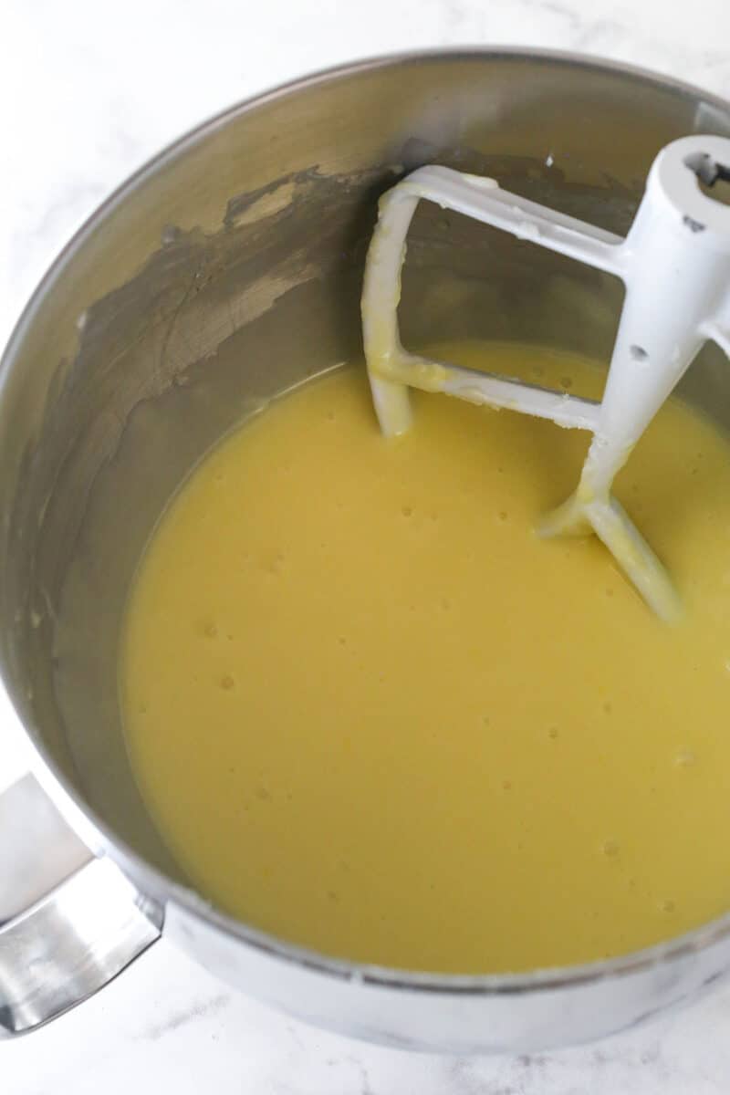 - Add the eggs one at a time, mixing well and scraping the bottom and sides of the bowl between each addition.