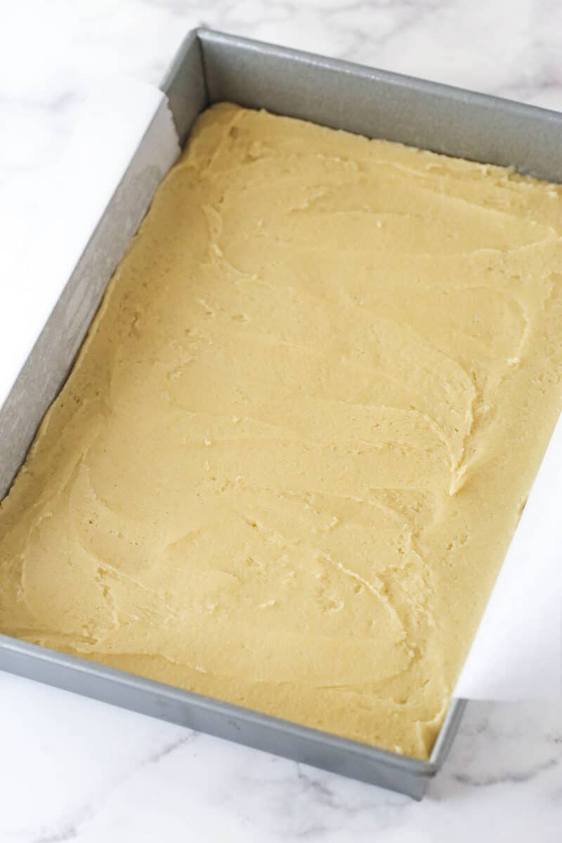 - Add the batter to the bottom of the cake pan and spread evenly. Set aside.