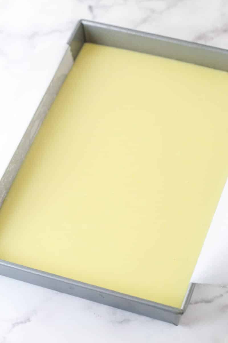 To start, you’ll want to preheat your oven to 350°F, spray a 9×13-inch cake pan with non-stick, and line it with parchment paper that hangs over the sides.