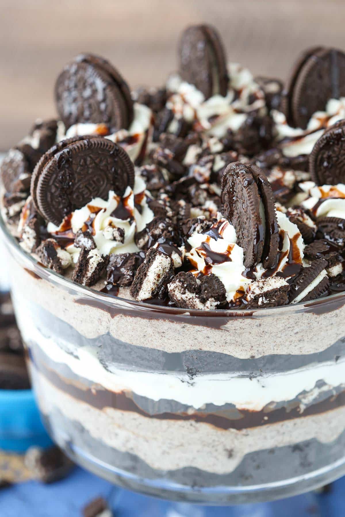 The best part is how easy it is to put trifles together. Layer everything together and you’re ready to go! I kind of like to give trifles a chance to sit in the fridge for a bit so things can all kind of come together, but if you’re in a hurry you could certainly serve it shortly after making it. The Oreo flavor is on full blast and when paired with the chewy brownies, it’s heaven in every bite.