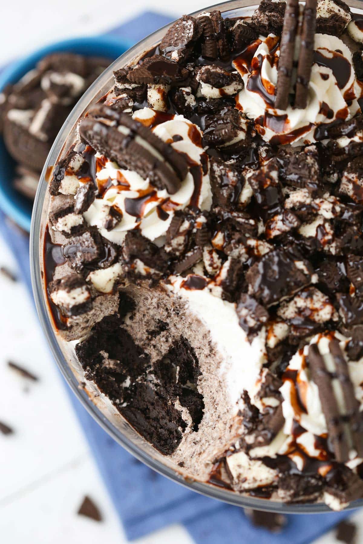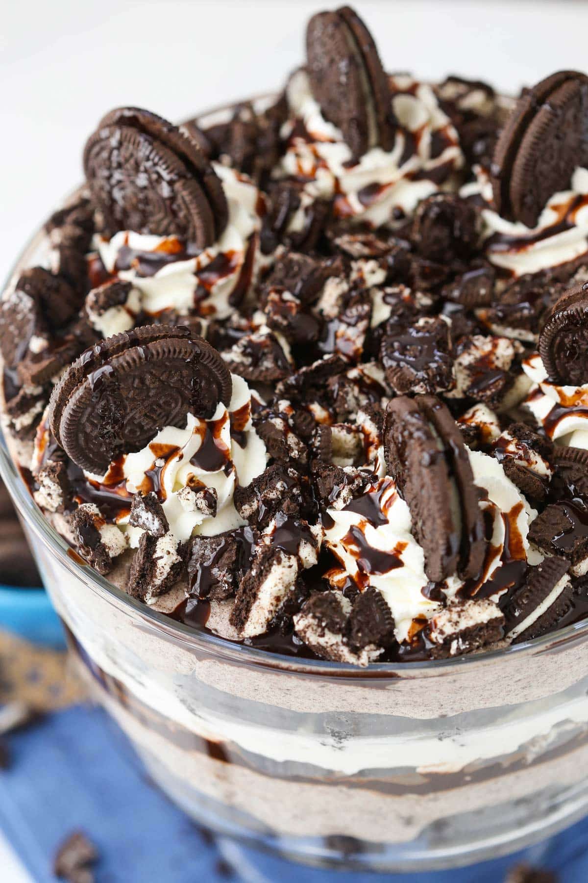 20. Finish off the trifle with some swirls of the remaining whipped cream, the remaining chopped Oreos and another drizzle of chocolate sauce.