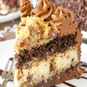 The frosting is made with real melted chocolate, making it a wonderfully chocolatey frosting. It alone is super tasty! Top the cooled cheesecake with a little more coconut pecan filling and the chocolate cake layer, then frost the sides. Press the mini chocolate chips into the sides of the cake, then finish the top with swirls of frosting and the remaining coconut pecan filling.
