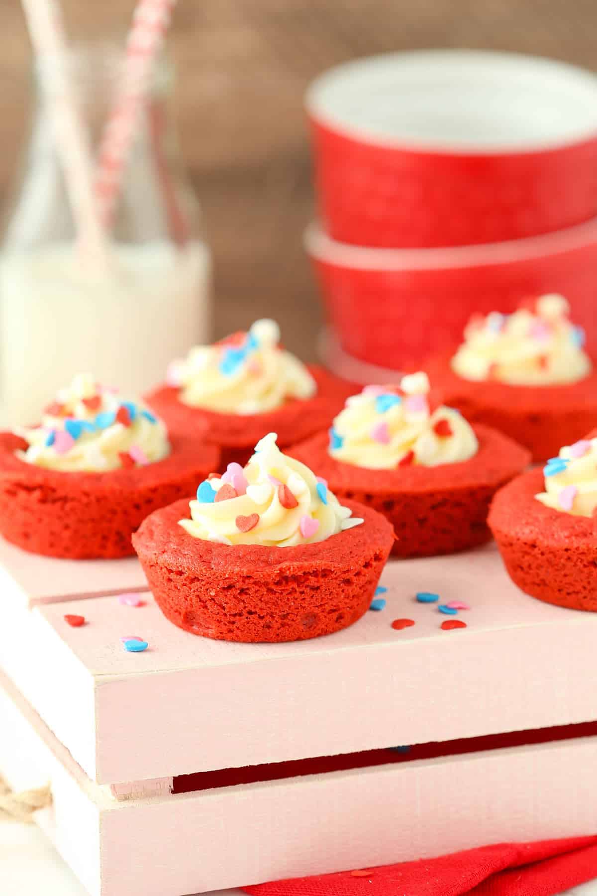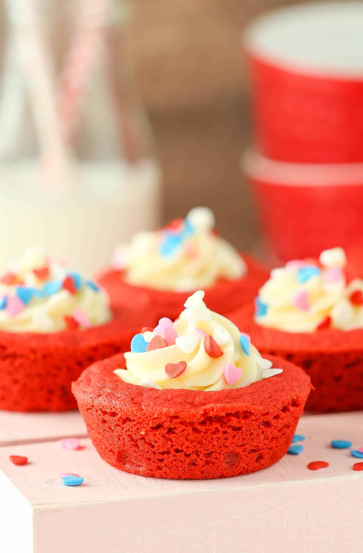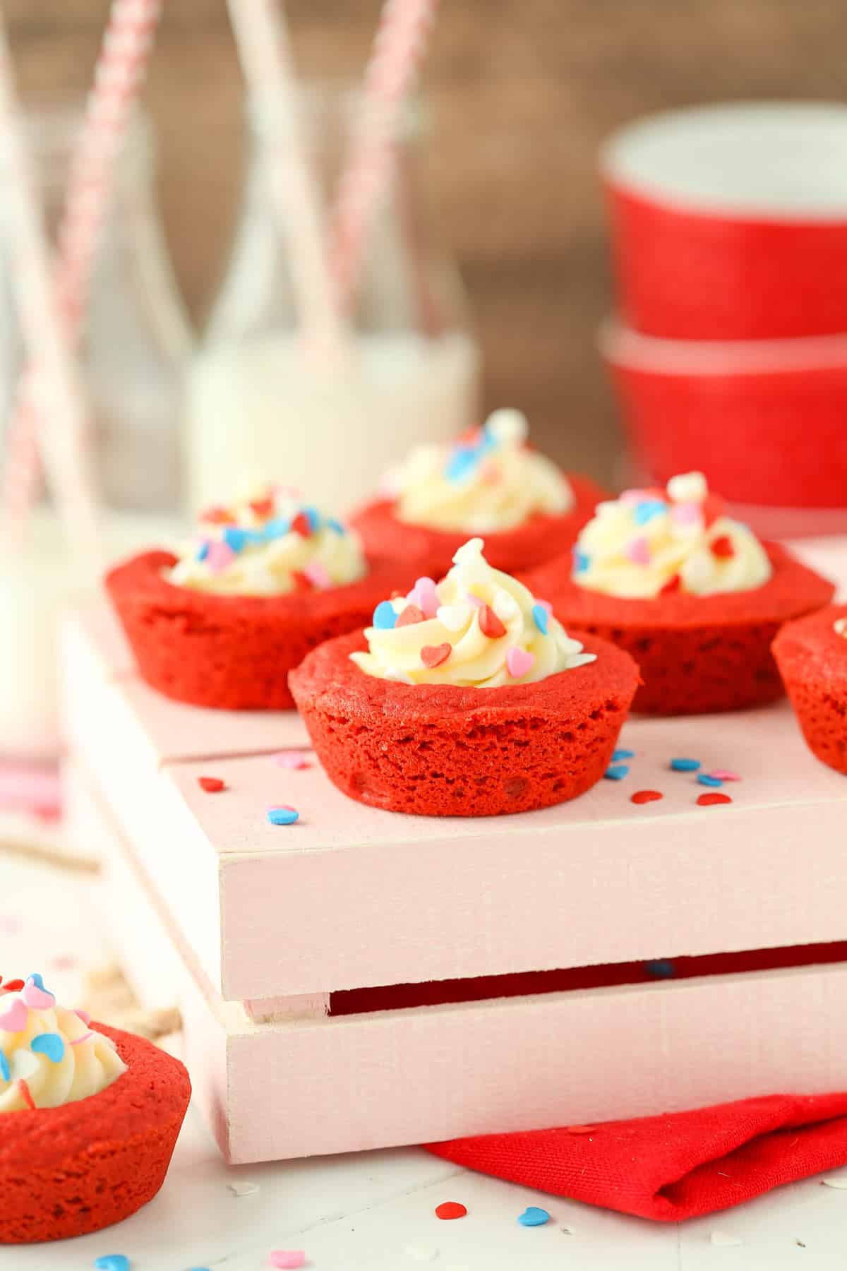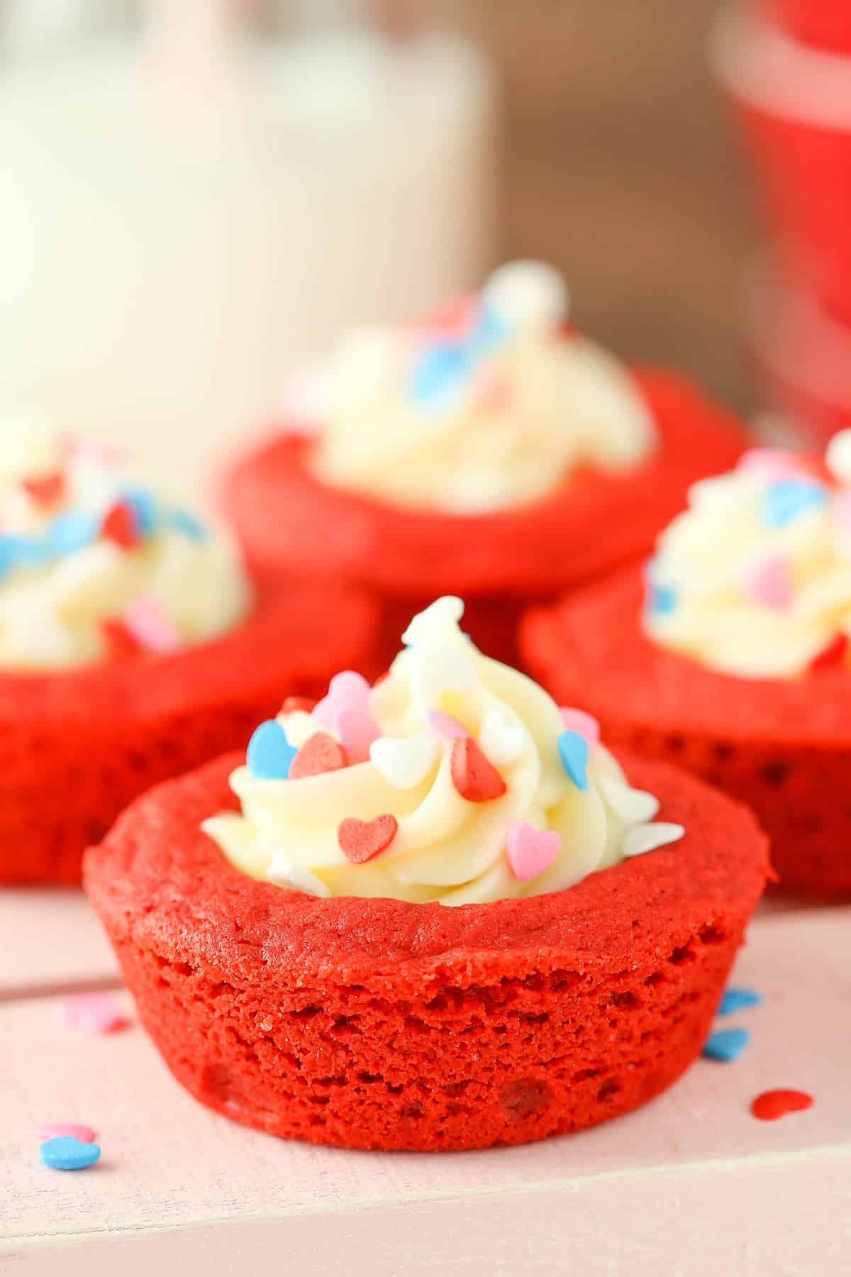 These easy Red Velvet Cheesecake Cookie Cups are soft, chewy, and full of classic red velvet cake flavor with a creamy cheesecake filling! These tasty little cheesecake cookies are perfect for Valentine’s Day!
