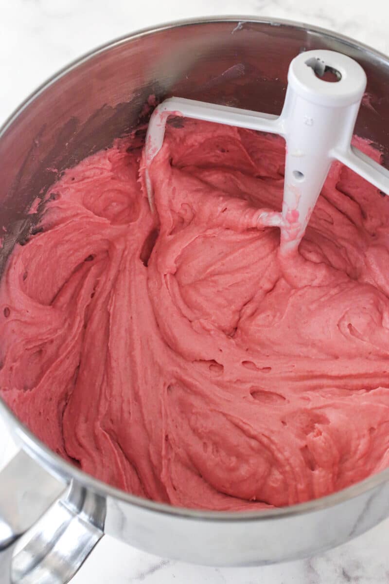 - Add half of the flour mixture to the batter and mix until combined. Add the milk/puree mixture to the batter and mix until combined. Add the remaining flour mixture and mix until well combined. Scrape down the sides of the bowl as needed to ensure everything is being combined, then stir in the food coloring. Set aside.