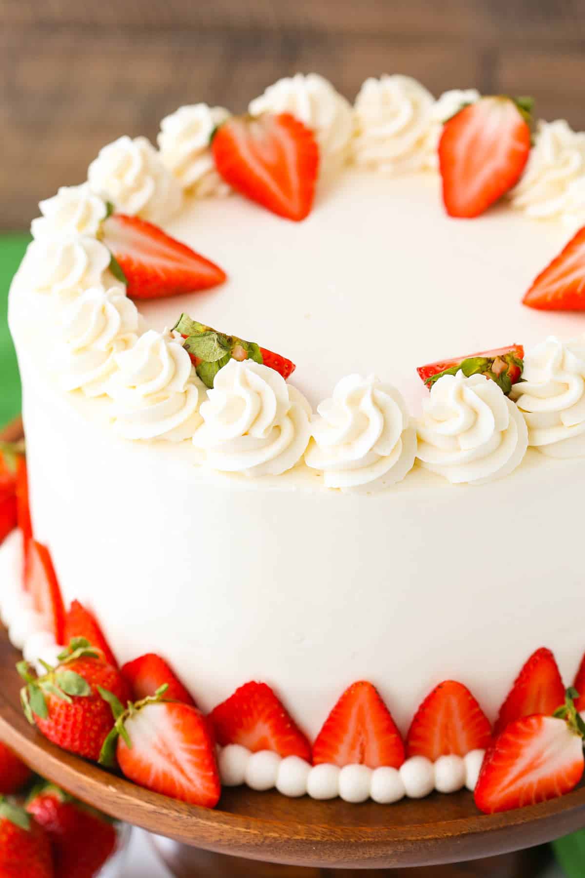 Because the frosting is a whipped cream and therefore is softer than my normal frostings, I wasn’t able to use my typical paper towel method of smoothing a cake. I used my offset spatula to apply the cream to the sides of the cake and smoothed it with my icing smoother. I finished the cake off with some fresh slices of strawberries. If you are going to be serving the cake at a later time after putting it together, you may want to add the strawberries shortly before serving so they don’t dry out.