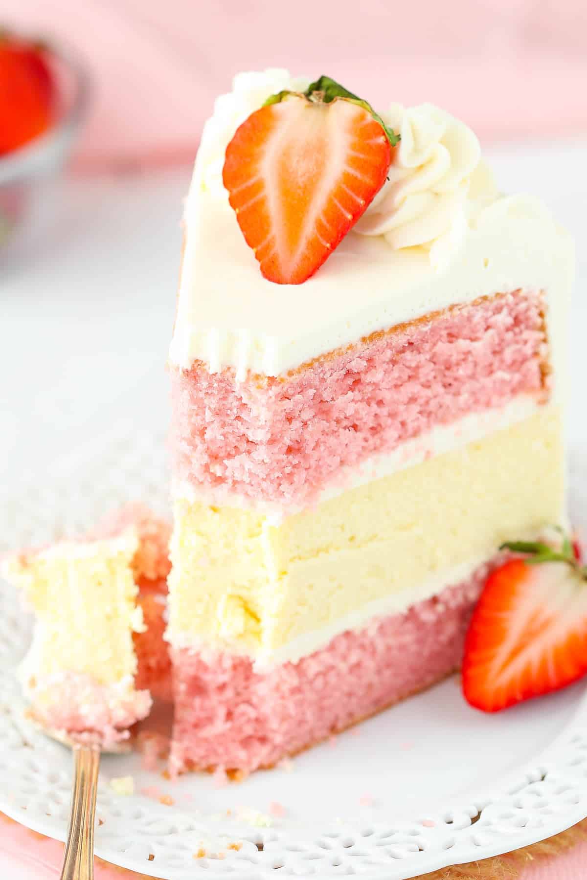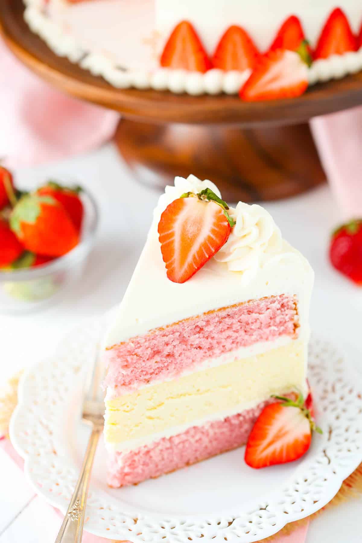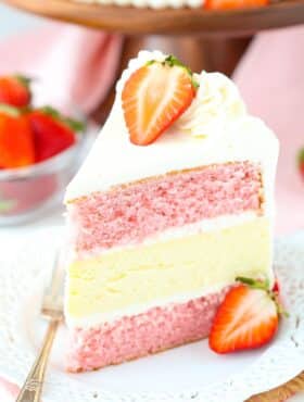 This Strawberries and Cream Cheesecake Cake is perfect in every way! With two layers of strawberry cake and a creamy layer of vanilla cheesecake in the middle, this cake is no joke.