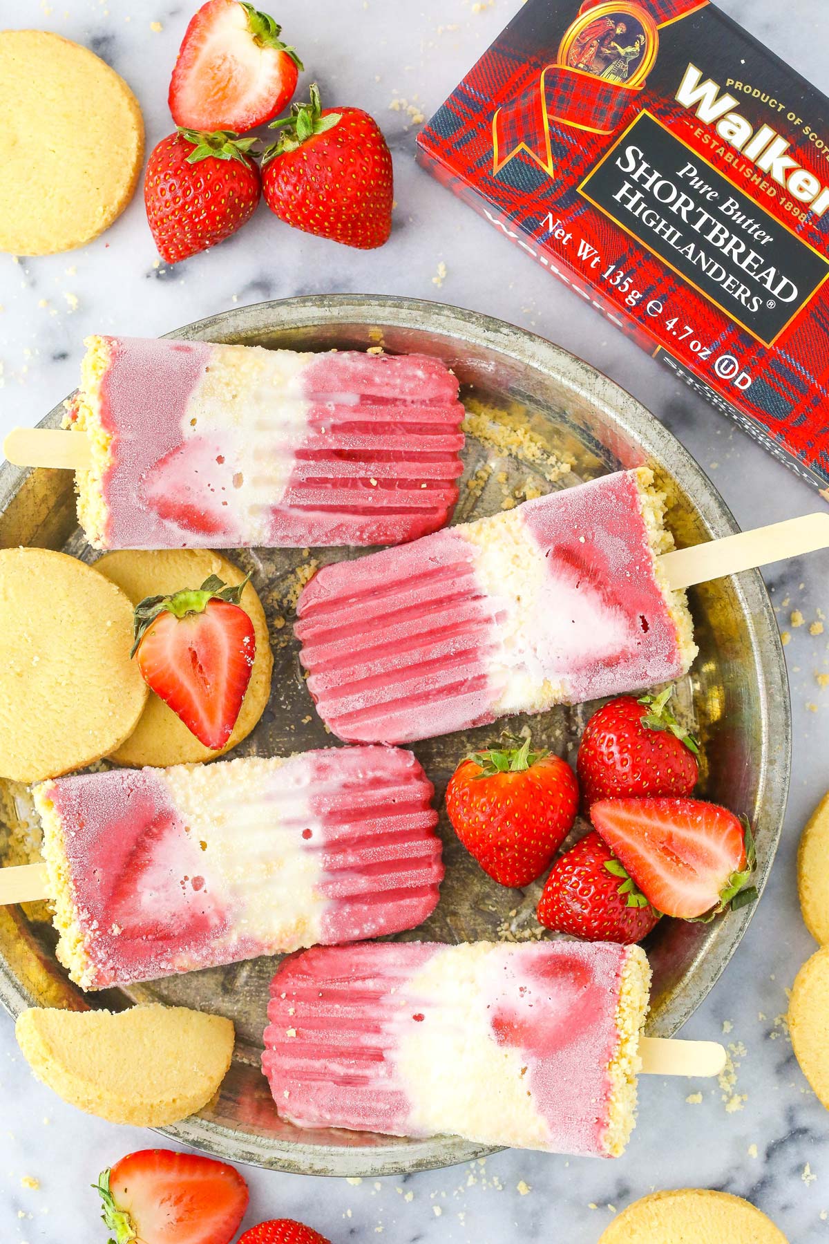 Plus, the middle layer is full of buttery and delicious Walkers Shortbread pieces that give these popsicles a super fun texture and really makes them taste just like strawberry shortbread. The sweetened vanilla milk is like the whipped cream in strawberry shortcake, and the buttery cookies soften just enough that it’s like biting into cake. I could probably eat an entire popsicle with just that layer – it’s that good and fun to eat.