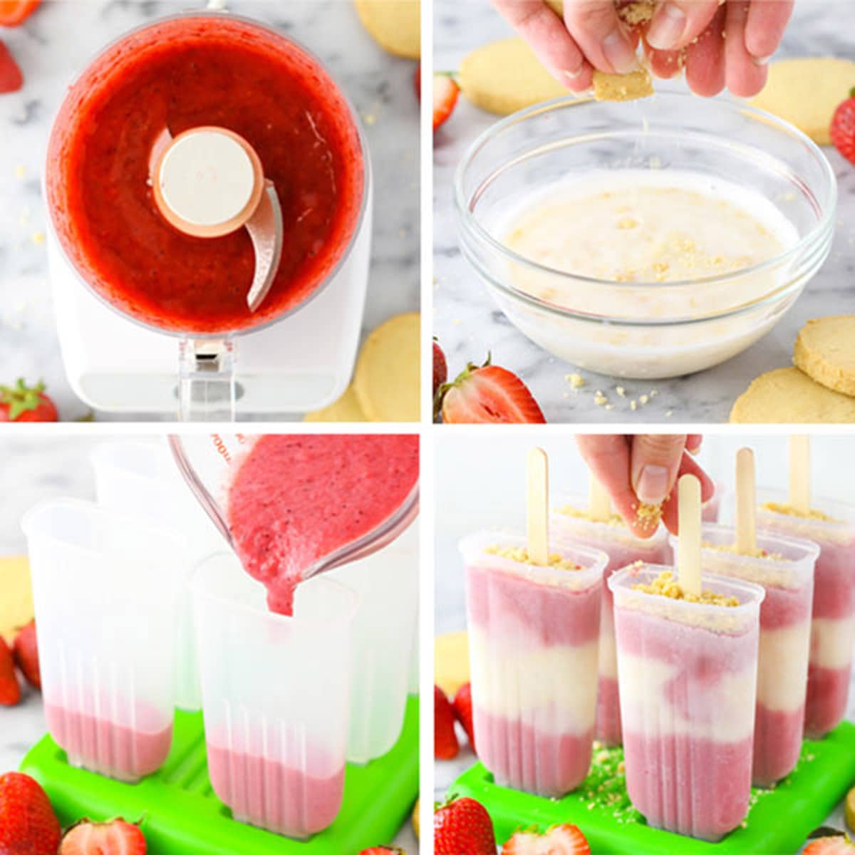 - Remove the popsicles from the freezer and divide the remaining strawberry mixture among the popsicles. Then sprinkle some crumbled shortbread on top.