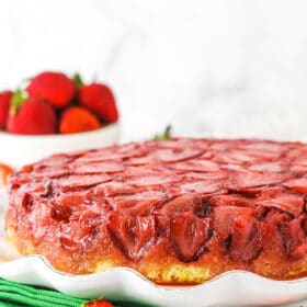 The strawberry topping is made with just 3 ingredients and baked right into the top of the cake, making this a super easy dessert. That’s one thing I’ve always loved about upside down cakes – they look fancy but in reality, they’re so easy!