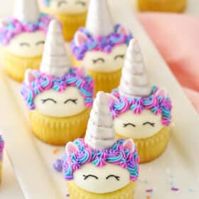 With an ice cream cone horn and marshmallow ears, these easy unicorn cupcakes are super adorable. They’re so cute you won’t want to eat them!