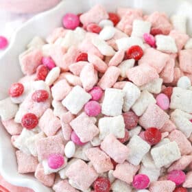 Valentine’s Day Strawberries and Cream Puppy Chow is a no bake dessert recipe that makes a cute & festive treat for Valentine’s Day. This easy puppy chow is perfect for sharing with family and friends!
